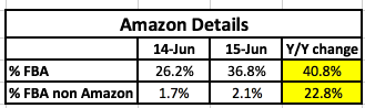 非亚马逊的FBA百分比:我们看看FBA带动的总交易额,以及非亚马逊销售(网站、其它第三方平台、付费搜索、比较购物引擎等)配送的百分比。2014年6月,1.7%是非亚马逊配送的。在2015年6月,增长至2.1%,增长幅度为22.8%。